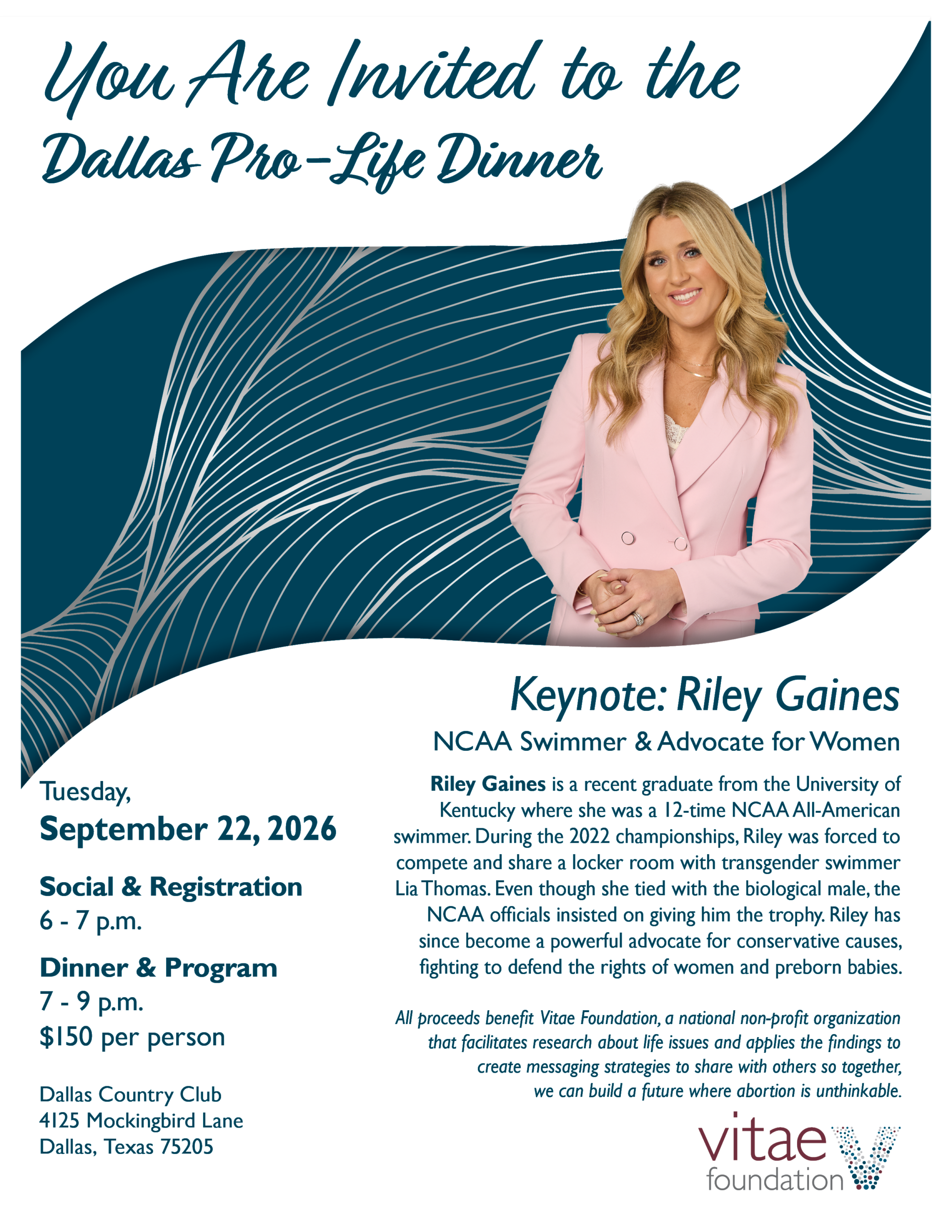 Event Sponsors are listed in all printed materials unless we are notified otherwise. Sponsors much meet print deadline of September 15, 2026. For every $2,500 gift, you will receive two tickets to the Sponsor Reception and photo with Riley Gaines.